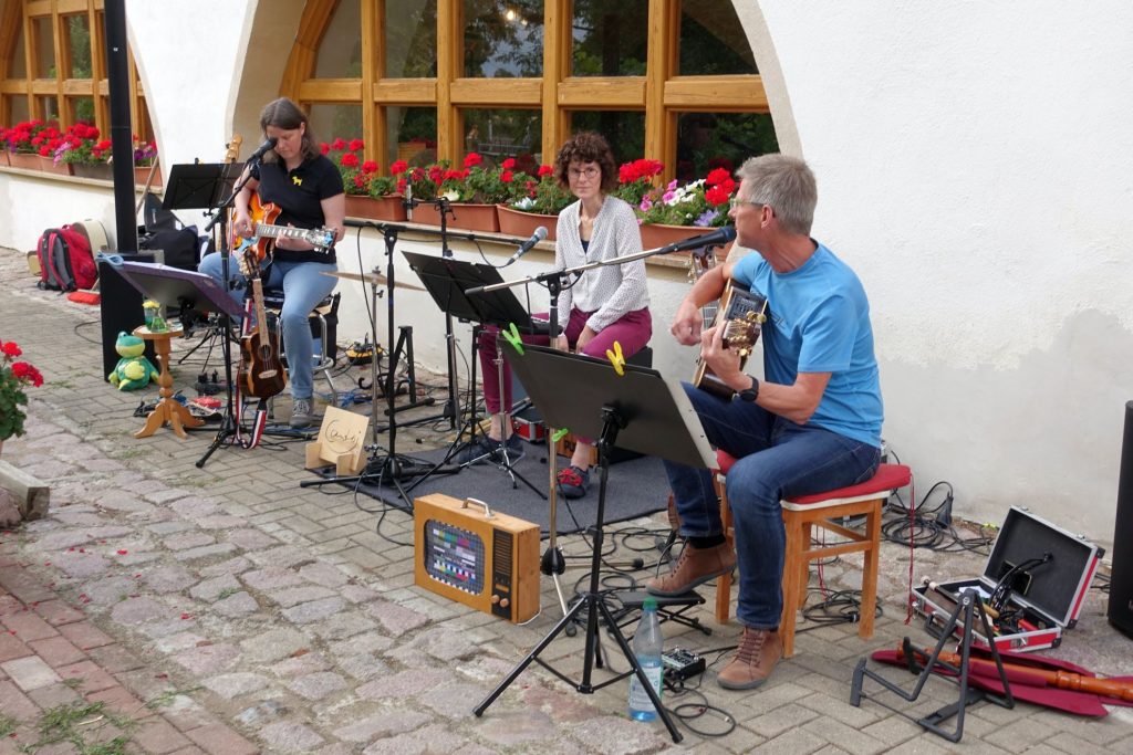 Kurz nach dem ersten Treffen von Gudrun und Michael gab es eine kleine Musik-Session von Anne und Micha. Anne trommelte zu Liedern von Micha und es entstand die Idee, gemeinsam mit Gudrun zu musizieren. Damit waren es schon drei.